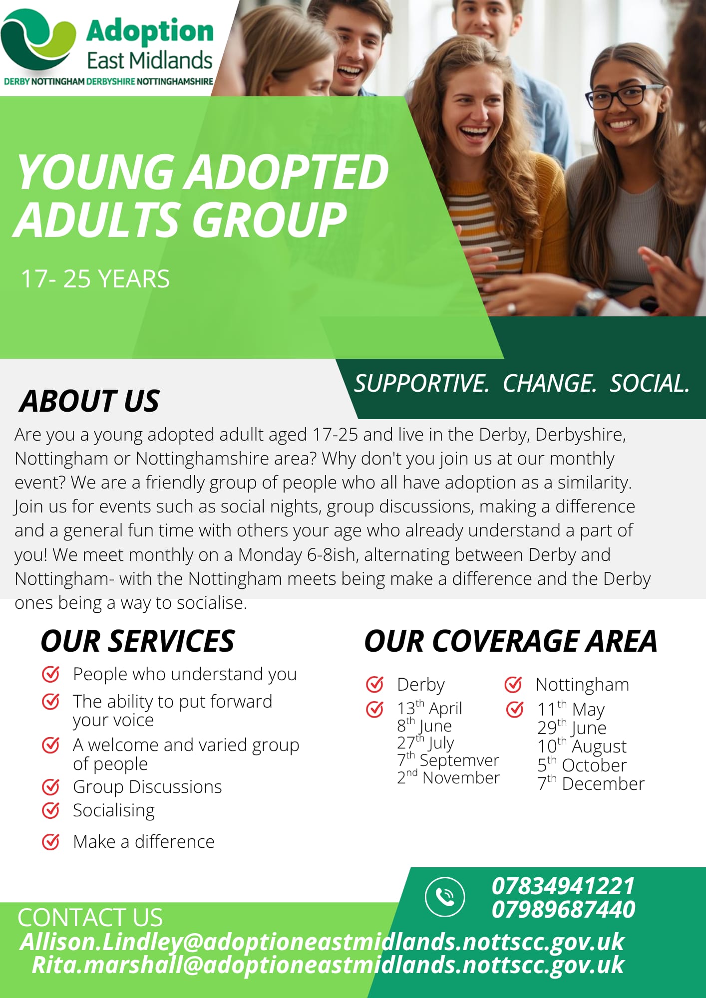 For more information please contact Allison Lindley on Allison.Lindley@adoptioneastmidlands.nottscc.gov.uk / 07834 941221 or Rita Marshall on Rita.Marshall@adoptioneastmidlands.nottscc.gov.uk / 07989 687440. You can also check out the group's flyer.